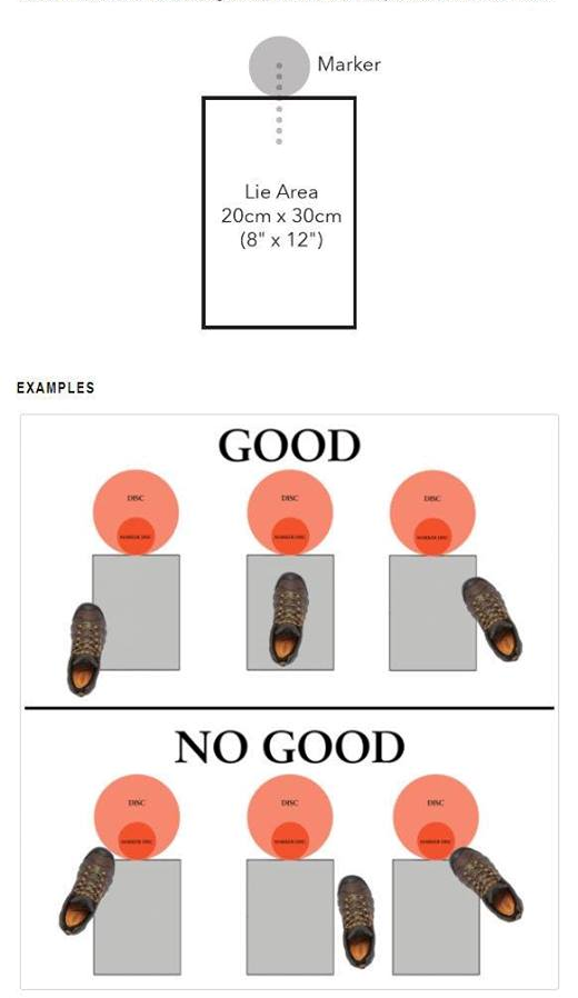 ・ディスクがリリースされた後であればマーカーディスクより前方の地面に接してよい。ただし、10m以内のパットの場合はマーカーディスクを拾うまでは前方の地面に接してはならない。